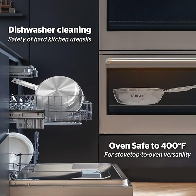 Sunhouse 18/10 11 Inch Stainless Steel Frying Pan, Whole-Clad No Coatings Skillet with Stay-cool Handle for Cooking, Durable & Oven Safe to 500°F, Dishwasher Safe, Compatible with All Cooktops