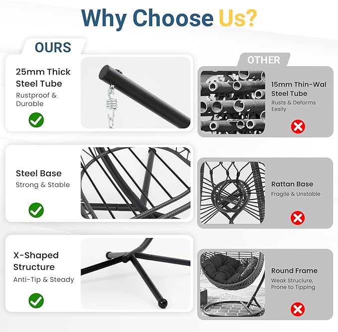 - Exceptional Support: We're committed to delivering top-notch products. If you have any inquiries about the RoyalCraft hanging egg chair, feel free to reach out to us right away. We're here to assist you promptly, address all your concerns, and ensure you have a satisfying patio furniture buying experience.