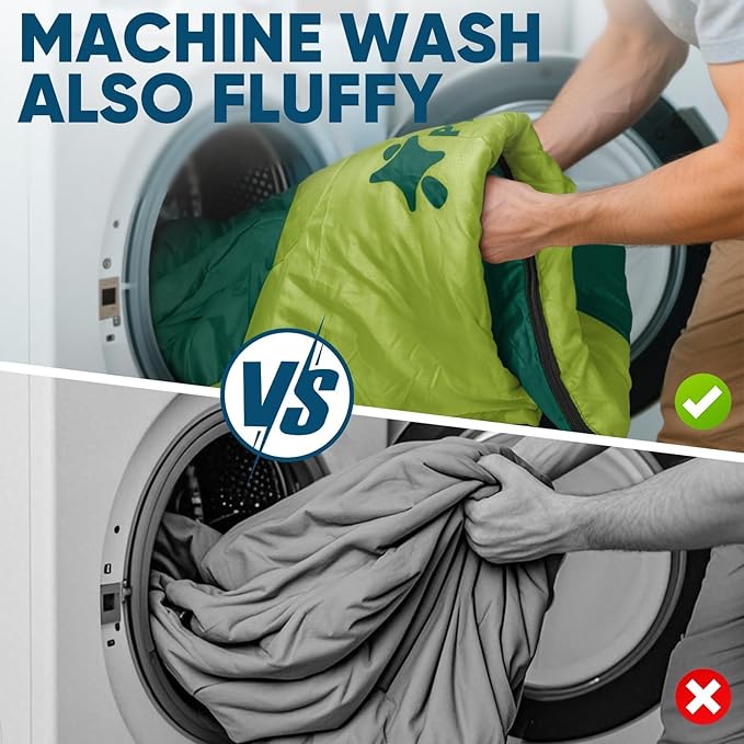 - Machine Washable: Crafted with double S-shaped stitching and Hollowfiber cotton filling, this sleeping bag is both water-resistant and windproof; The spun cotton inner lining ensures softness and warmth, maintaining its thermal efficiency even after machine washing without clumping