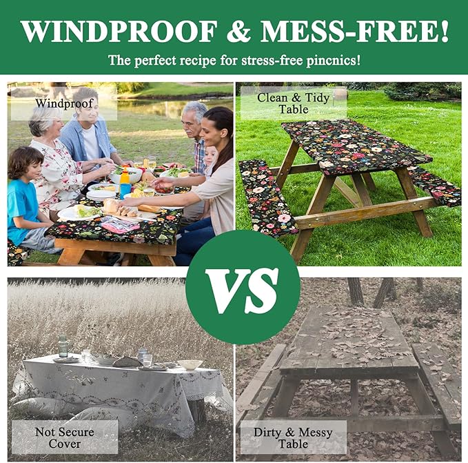 famibay 3 Piece Picnic Table Cover and Bench Covers Black Floral Polyester Camping Tablecloth, Windproof Reusable Fitted Picnic Table Covers with Elastic(12”x72+30”x72”)