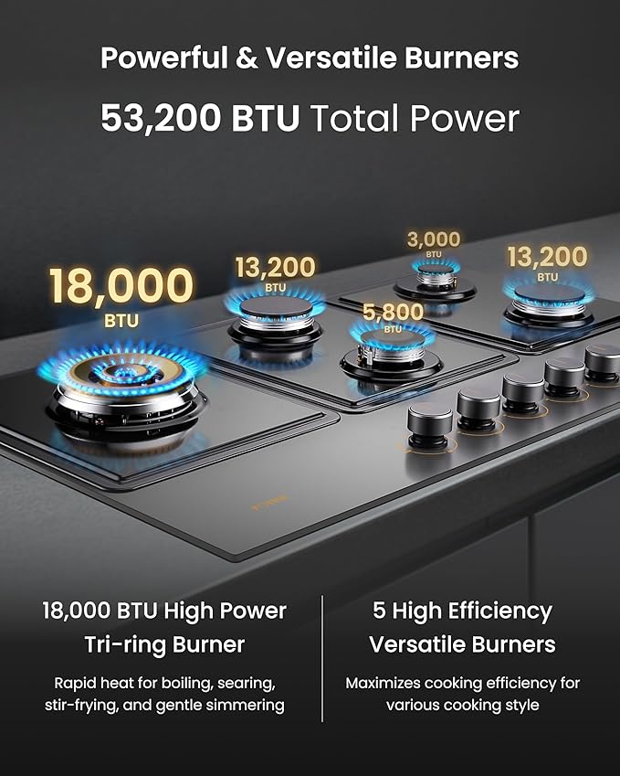 - Versatile Tri-ring Burner - FOTILE GLG36501-Y culinary grade cooktop is excellent for cooking in versatile styles with a 18,000 BTUs high output tri-ring center burner for boiling, searing, pan frying and stir-frying, a 13,000 BTUs burner offering high heat, and two dedicated simmer burners with 6,000 and 3,000 BTUs delivering consistent and accurate low heat for delicate cuisines.