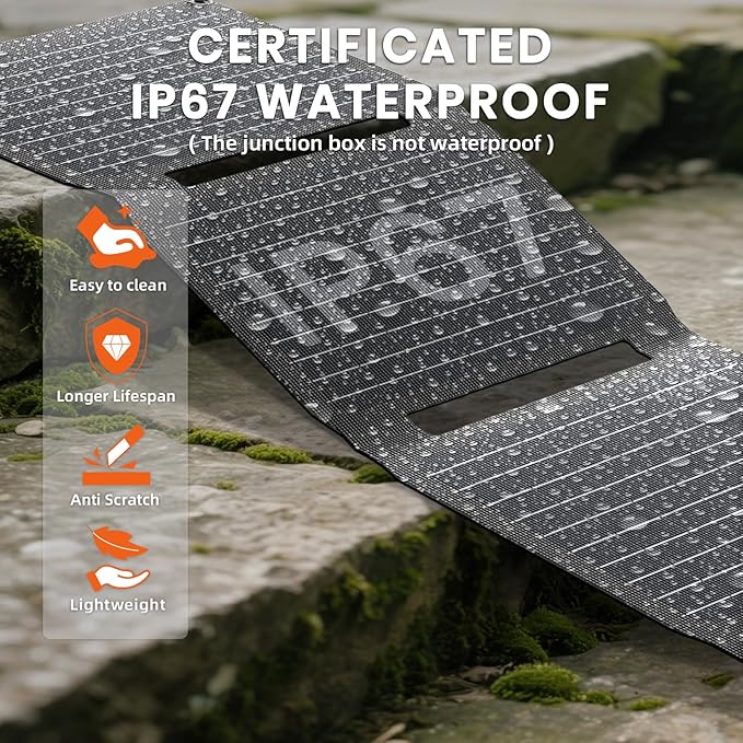 - IP67 Weather Resistance: Survives rain, splashes, and dust (excluding the non-waterproof junction box). Includes a 40W panel, 2 carabiners, a manual, and 24/7 customer support.