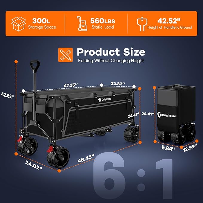 - ใ๐ญ๐ฌ.๐ฏ๐ฒ ๐ฐ๐ ๐ณ๐ ๐๐ฎ๐ฟ๐ด๐ฒ ๐๐ฎ๐ฝ๐ฎ๐ฐ๐ถ๐๐ ๐๐ถ๐๐ต ๐ฆ๐บ๐ฎ๐น๐น๐ฒ๐ฟ ๐๐ผ๐น๐ฑ๐ฒ๐ฑ ๐ฆ๐ถ๐๐ฒ ๐ฃ๐ผ๐ฟ๐๐ฎ๐ฏ๐น๐ฒ ๐๐ผ๐น๐น๐ฎ๐ฝ๐๐ถ๐ฏ๐น๐ฒ ๐๐ฒ๐ฎ๐ฐ๐ต ๐ช๐ฎ๐ด๐ผ๐ปใOriginsure foldable wagon cart, 48.43 "L x 24.02 "W x 24.41 "H large unfolding size, 10.36 cu ft/300L massive storage space, triple the capacity of similar wagons. Adopting an innovative folding design that maintains its height, the Capacity reduces to 1.36 cu ft when folded, only 1/3 of other carts. Compact and space-saving, it can be perfectly stored in the car trunk and room corners.