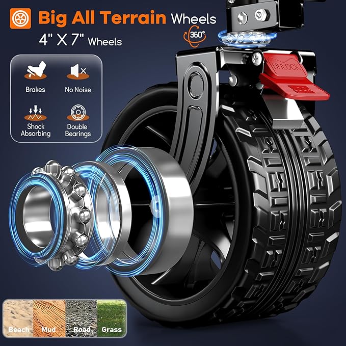 - ใ๐ฏ๐ฒ๐ฌ ๐ฅ๐ผ๐๐ฎ๐๐ถ๐ผ๐ป ๐จ๐ป๐ถ๐๐ฒ๐ฟ๐๐ฎ๐น ๐๐น๐น-๐๐ฒ๐ฟ๐ฟ๐ฎ๐ถ๐ป ๐๐ถ๐ด ๐ช๐ต๐ฒ๐ฒ๐น๐ ๐๐ถ๐๐ต ๐๐ฟ๐ฎ๐ธ๐ฒ๐, ๐ฆ๐๐ถ๐๐ฎ๐ฏ๐น๐ฒ ๐ณ๐ผ๐ฟ ๐ฉ๐ฎ๐ฟ๐ถ๐ผ๐๐ ๐ฅ๐ผ๐ฎ๐ฑ ๐ฆ๐๐ฟ๐ณ๐ฎ๐ฐ๐ฒ๐ใThis beach carts features 4 larger and wider 7"x4" double bearings all-terrain big wheels, allowing for flexible steering and smooth rolling on various road surfaces such as mud, grass, and hard sand. The two 360ยฐ rotation front wheels with brakes, effectively to stop and prevent the wagon from moving. It' s shock-absorption and noise-reduction, ensuring durability and resistance to wear and tear.