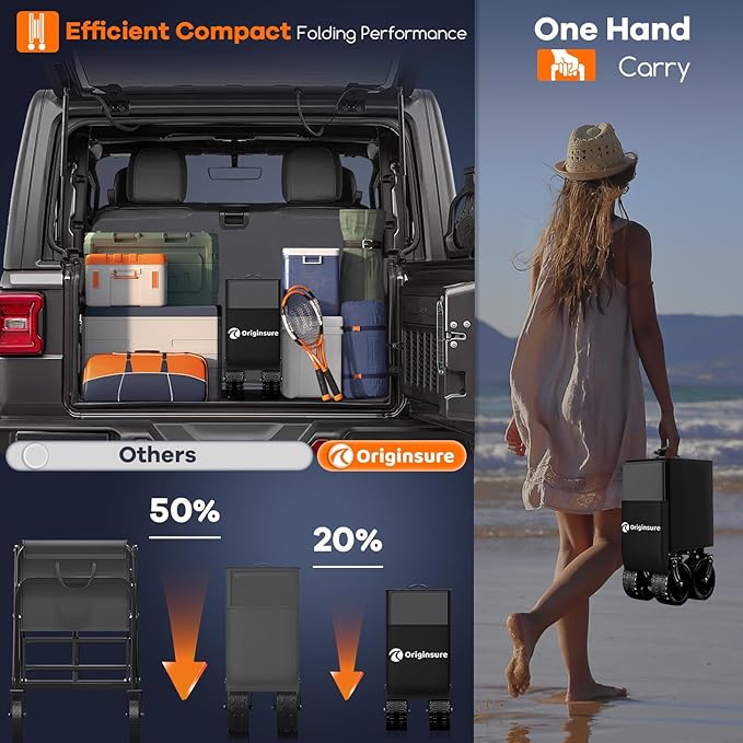 - ใ๐ฃ๐ฟ๐ผ๐ฑ๐๐ฐ๐ ๐ฆ๐ถ๐๐ฒ & ๐๐ฐ๐ฐ๐ฒ๐๐๐ผ๐ฟ๐ถ๐ฒ๐ใOriginsure folding carts unfolded size: 48.43"x 24.02"x 24.41"(42.52"), folded size๏ผ9.84"x 12.99"x 24.41", wheel size๏ผ7"x 4", handle height from Ground: 42.52", with 1 Side Pocket, 2 Mesh Cup holders, 1 Storage Cover, and 1 Strap. Ready to use right out of the box, no assembly required.