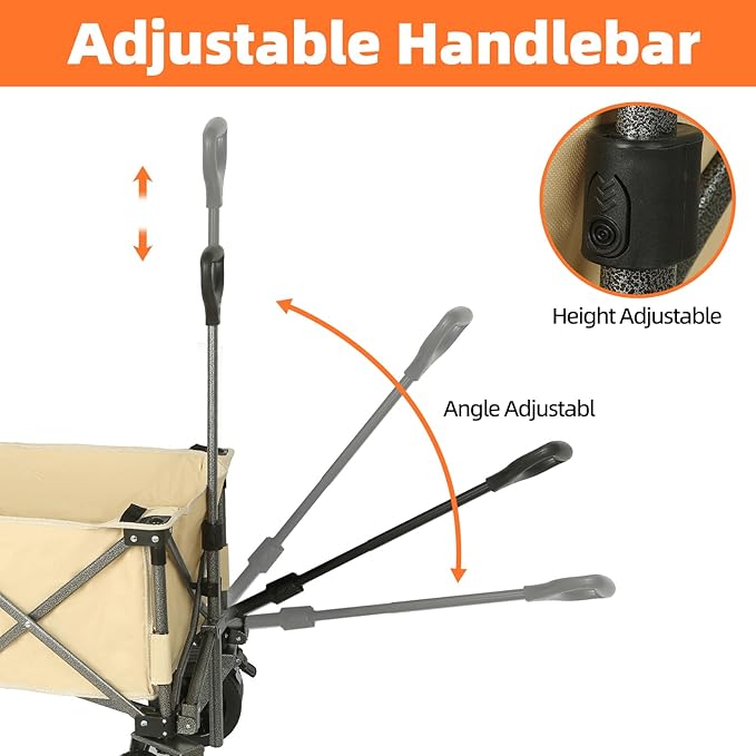 - Durable Wheels: The folding wagon come with heavy duty 3.8”X 6.7” thick wide PU wheels. This collapsible wagon has adjustable and telescopic handle for effortless transport and easy control on most terrains. It pretty compact when folded and can be carried anywhere