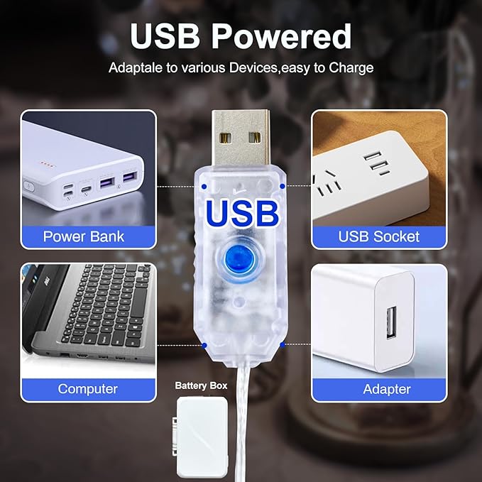 - USB & Battery Dual Powered String Lights: 2 power supply methods are suitable for any scene and location; No more worrying about power outlet or changing batteries frequently; Use USB plugs indoors to achieve optimal lighting effects; Outdoors or in places without sockets, you can use batteries for power supply; Decorate your party with our string lights now (Note: USB power adapter and 3AA battery are not sold with the order)