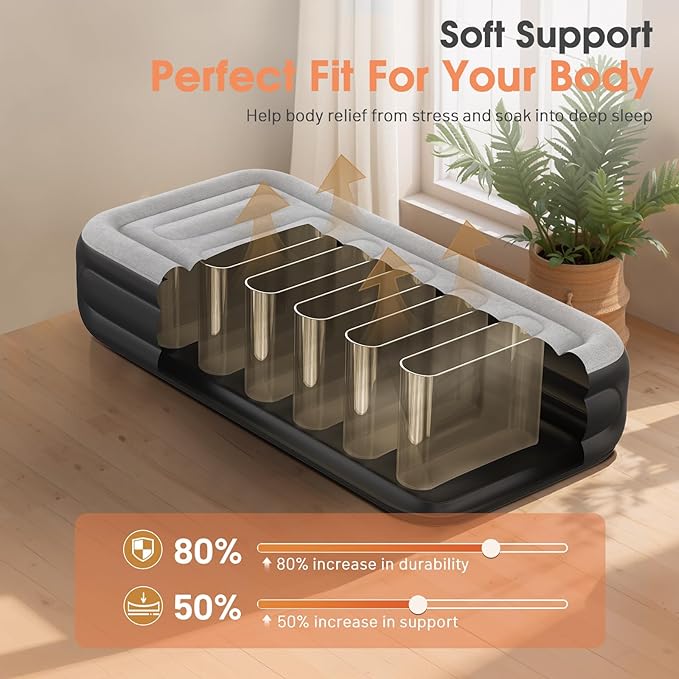 - 【Enhanced Thickness & Anti-Slip Base】Crafted from eco-friendly, durable material that’s 30% thicker than standard options, this air mattress twin is designed to resist punctures and leaks, even from playful pets. The anti-slip base keeps the inflatable mattress firmly in place, reducing noise and ensuring a peaceful, quiet sleep