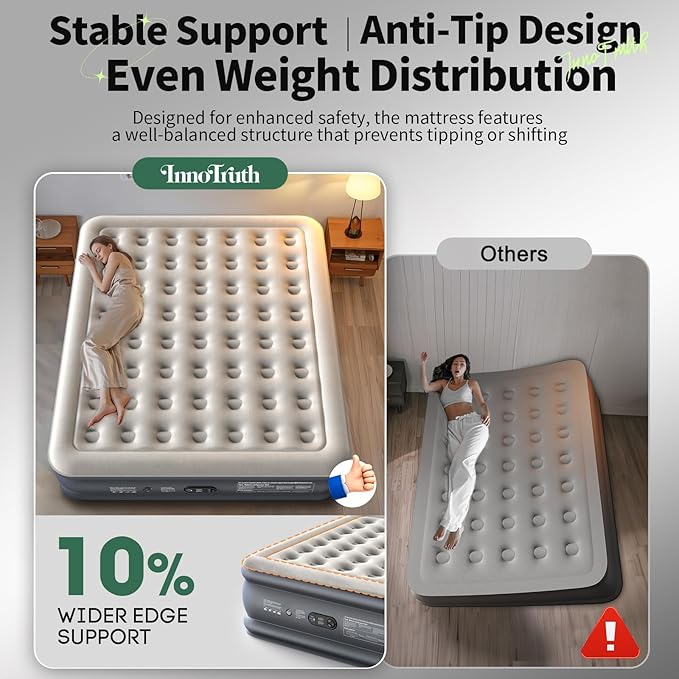 - ๐๐ซ๐๐ฆ๐ข๐ฎ๐ฆ-๐๐ซ๐๐๐ ๐๐๐ญ๐๐ซ๐ข๐๐ฅ๐ฌ: Made with 10% thicker, upgraded PVC, the InnoTruth airbed provides enhanced durability and reliable support. Its reinforced surface resists daily wear and tear, while the quiet, non-slip base keeps the mattress securely in place throughout the night