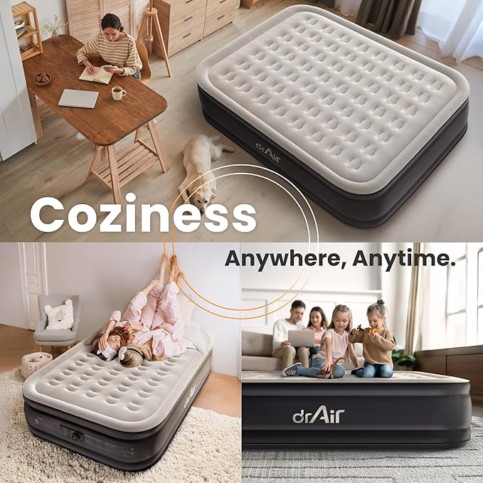 - 【UPGRADED BUILT-IN AIR PUMP】Dr. Air King-sized air mattress inflates 31% faster and 50% noise-reducing than similar products with an upgraded built-in electric pump, taking just 2-3 minutes. Its upgraded design offers quick, reliable performance while effectively minimizing leaks and 1-click inflation and deflation.(Compatible with 110V)