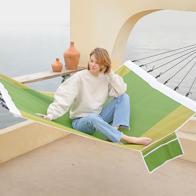 - ✅DOUBLE HAMMOCK & SPACIOUS ENOUGH TO SHARE: The comfort that comes with extra space is vital to us, and its size also boasts a wider range of versatility, allowing it to be hung from a 12-14ft hammock stand (not included) or used outdoors on its own.The hammock bed's dimension is 77" L * 57" W, the length from chain to chain is 14', larger than other quilted hammocks.