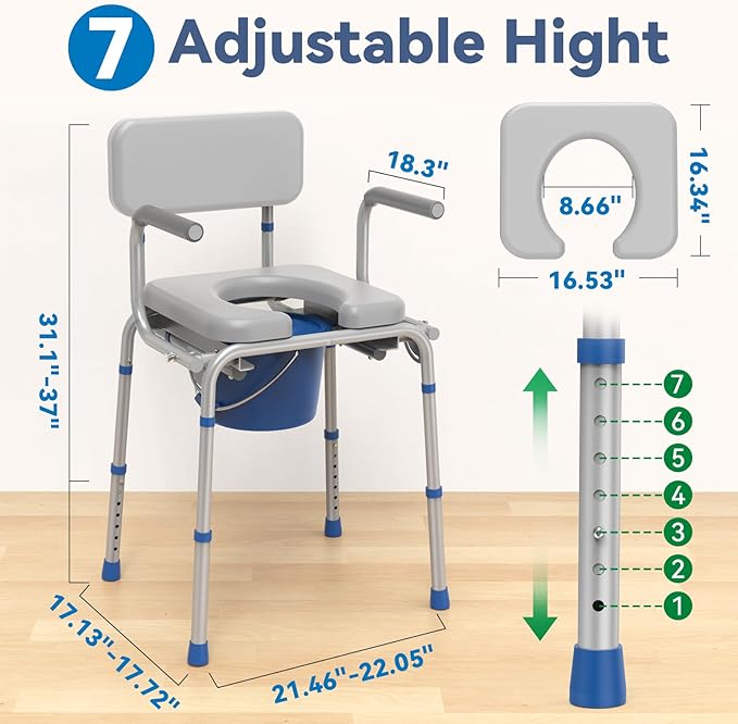 - Adjustable Height: The commode chair has 7 adjustable settings for height 31-37 inches, allowing you to find the perfect height for comfort and convenience