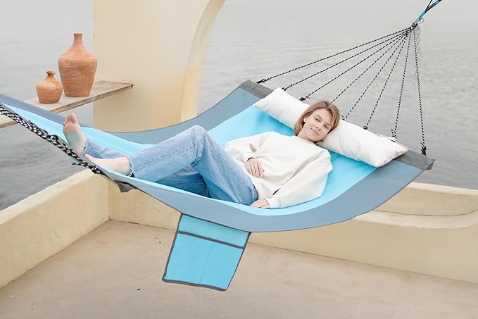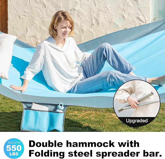 14ft 2 Person Outdoor Hammock, Portable Camping with Folding Steel Spreader Bar, Carrying Bag, Carabiners, Tree Straps, Pillow & Sidebag, Quick Dry Textilene, 550 lbs Capacity (Lakeside Aqua)