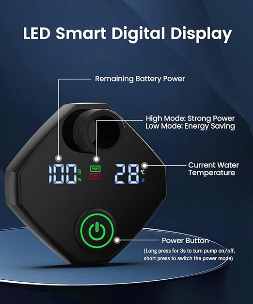 - 【Smart Display, Easy Operation】Acare camp shower pump equites with 2 pressure mode, meet your gentle rinse tasks or deep cleaning needs. The smart LED digital display shows precise water temperature (32℉-140℉) and remaining battery percentage, eliminate the worry of unexpected power loss during outdoor showers.