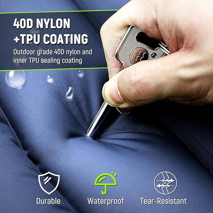 - 【Camping Grade Material】This sleeping mat is made of 40D nylon coated with TPU coating, providing extreme pressure-bearing. The edge of the camping mat is heat-sealed, so you don't have to worry about air leaks or tears, even under harsh conditions, providing extreme pressure-bearing(880lbs). Note: Weight-bearing capacity is based on this criterion.