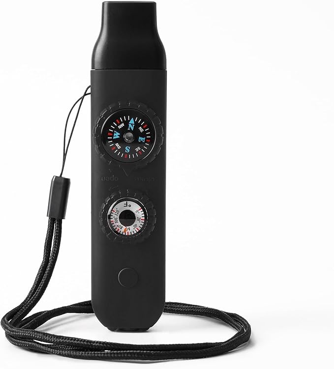 - The 7-in-1 Safety Whistle sets 7 functions including Emergency Whistle, Compass, Thermometer, LED Signal Light, Magnifying Glass, Reflector and Sealed Warehouse with good playability (The uniquely designed miniature built-in storage bin can be used to store important personal information, allowing rescuers to grasp your situation at the first time) (NOTE: If you need help in an emergency, you can try whistling softly, which is louder than whistling at full force)