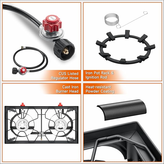 - ๐Complete Accessories Included: Heavy-duty iron pot stand*1 (stability even with large pots);Ignition rod *1(quick lighting);CUS Listed Regulator Hose *1(safety-certified for propane stoves)