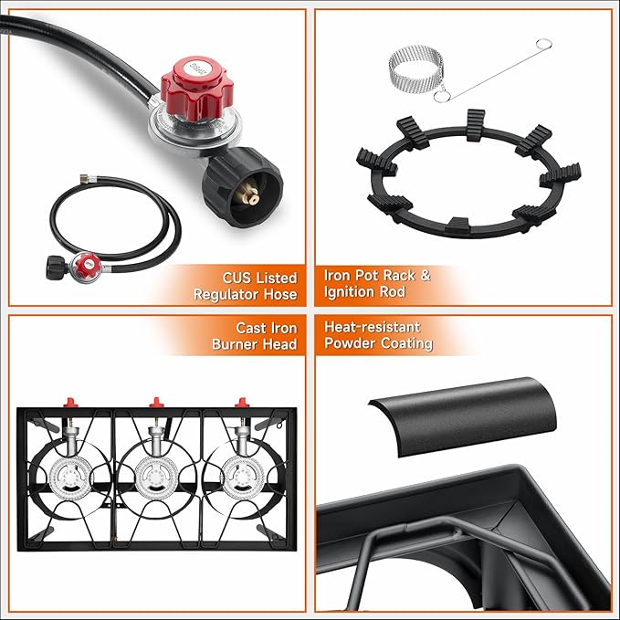 - 🍖Complete Accessories Included: Heavy-duty iron pot stand *1(stability even with large pots);Ignition rod*1 (quick lighting);CUS Listed Regulator Hose*1 (safety-certified for propane stoves).