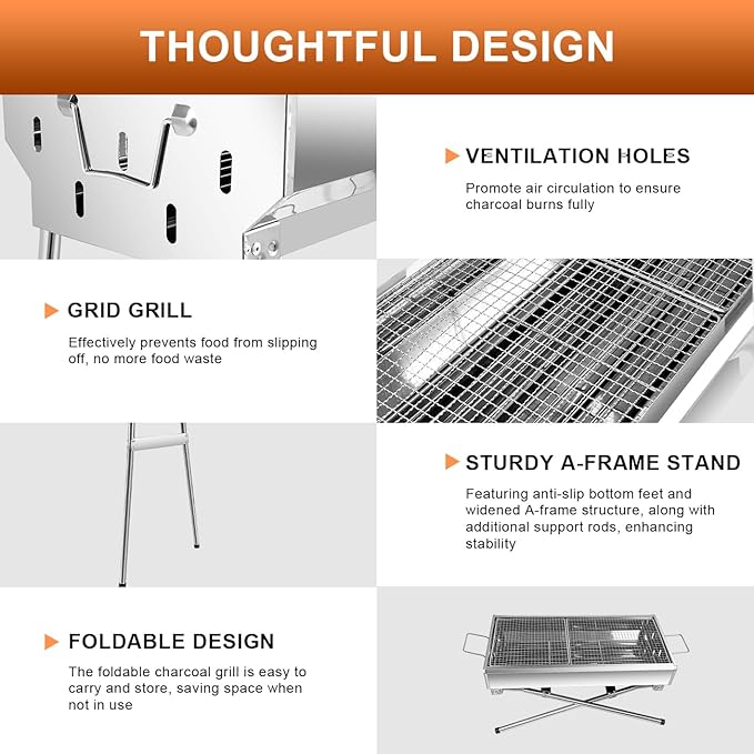 - Material: Stainless steel barbecue grill, durable and sturdy, anti-slip tripod, H-shaped structure for greater stability