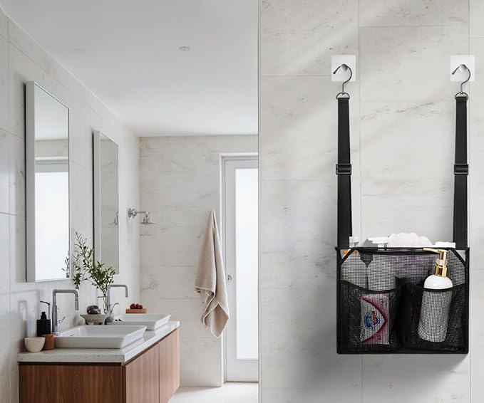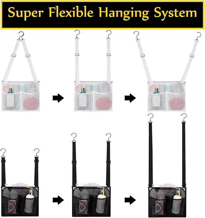 - Flexible & Versatile Hanging System: Adjustable hanging straps (adjustable from 10'' to 19'' height) with metal hooks enable easy attachment to shower rods, doorknobs, towel racks, or doors, keeping your items off floor and always at an easily accessible height.