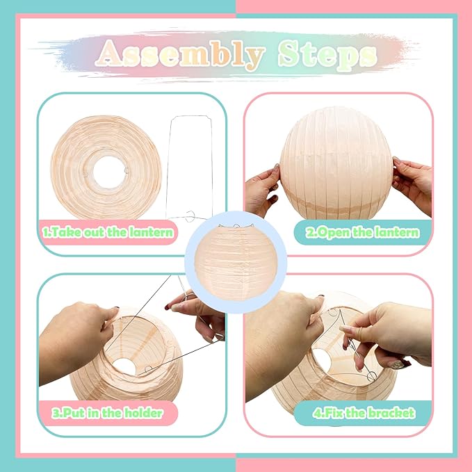 - ?�Easy to assemble?? Our soft pastel paper lanterns are easy to unfold, assemble and hang up, and they can be folded flat for storage. All you need to do is to pull the two ends gently to open the lantern and insert the metal frame (included in the pack) into the lantern to keep its shape.