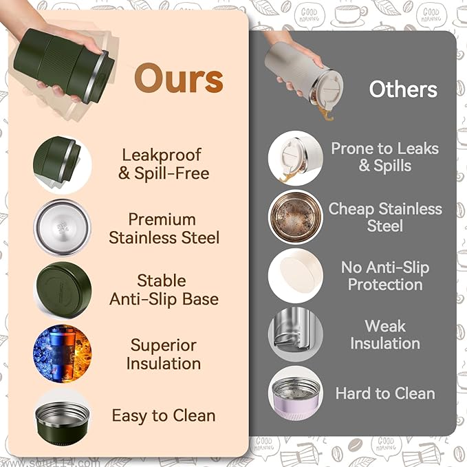 - Superior Thermal Insulation: Featuring advanced double-wall vacuum insulation, this travel mug effectively preserves the temperature of your beverage without causing heat transfer or condensation on the outer surface. Whether you're enjoying a hot brew or a cold refreshment, your drink stays enjoyable from the first sip to the last.