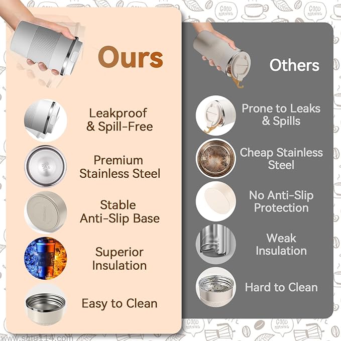 - Superior Thermal Insulation: Featuring advanced double-wall vacuum insulation, this travel mug effectively preserves the temperature of your beverage without causing heat transfer or condensation on the outer surface. Whether you're enjoying a hot brew or a cold refreshment, your drink stays enjoyable from the first sip to the last.