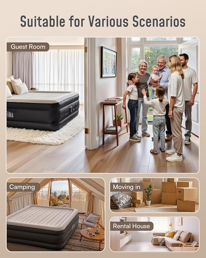 - Wide Applications: King inflatable mattress is perfect for overnight guests, home use, visit, moving, party, travel and camping.