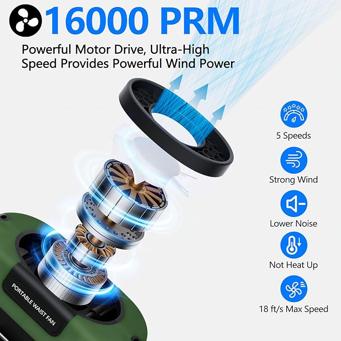 AI Portable Waist Clip Fan, Upgraded 10000mAh Rechargeable Battery Wearable Belt Personal Fan, 16000RPM Powerful 5 Speeds Shirt with Flashlight Neck Hands-Free 40H Cooling (Green)
