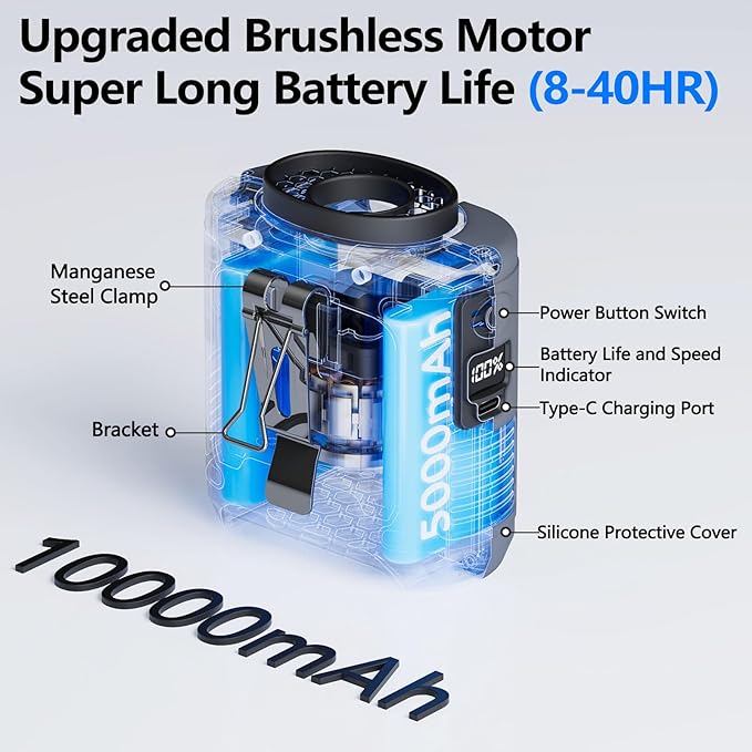 AI Portable Waist Clip Fan, Upgraded 10000mAh Rechargeable Battery Wearable Belt Personal Fan, 16000RPM Powerful 5 Speeds Shirt with Flashlight Neck Hands-Free 40H Cooling (Blue)