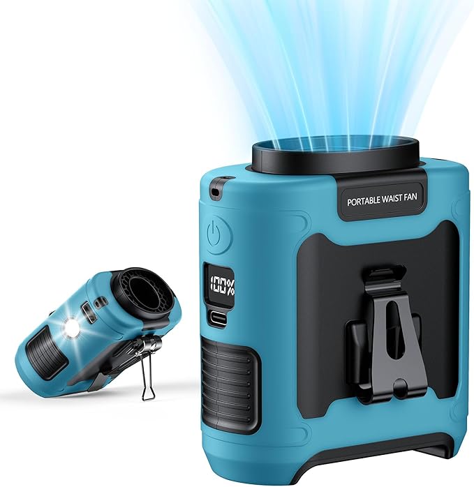 - 【Full upgraded and Drop-Resistant】Our waist fan is designed for various outdoor usage scenarios. It comes with a high-quality protective silicone leather case which protects from shock when dropped and ensures the body fan is not damaged at all. The addition of a protective silicone cover not only provides anti-slip function but also makes it more resistant to drops. The upgraded Manganese steel clamp provides stronger gripping force, always keeping the wearable fan firmly, and is more durability.