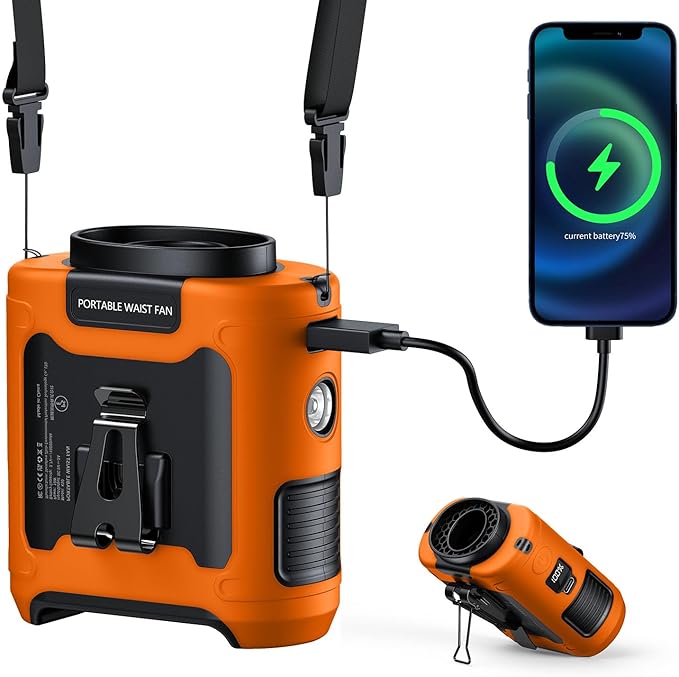 - [Rugged, Shockproof, and Anti-Slip Build] Built to withstand harsh outdoor environments, this portable waist fan features a protective silicone cover for enhanced grip and drop resistance. The reinforced manganese steel clip provides a firmer hold compared to standard plastic clips, ensuring the fan stays securely in place during high-movement activities like construction, delivery tasks, or outdoor adventure