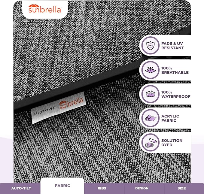 Midtown Umbrellas Sunbrella Umbrella 8 Feet Outdoor Umbrella With Sunbrella Cast Slate Acrylic Fabric - Auto-Tilt Aluminum Frame Patio Umbrella For Backyard, Deck, Garden, Pool - Black Pole
