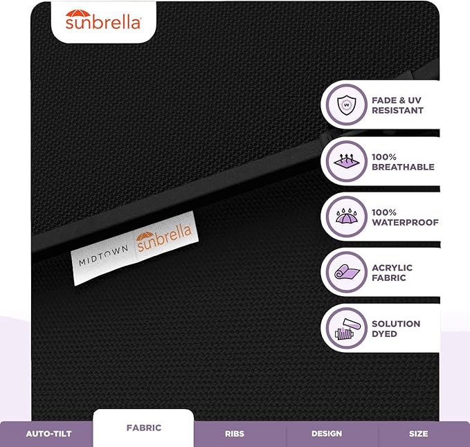 Midtown Umbrellas Sunbrella Umbrella 9 Feet Outdoor Umbrella With Black Acrylic Fabric - Auto-Tilt Aluminum Frame Patio Umbrella For Backyard, Deck, Garden, Pool - Black Pole
