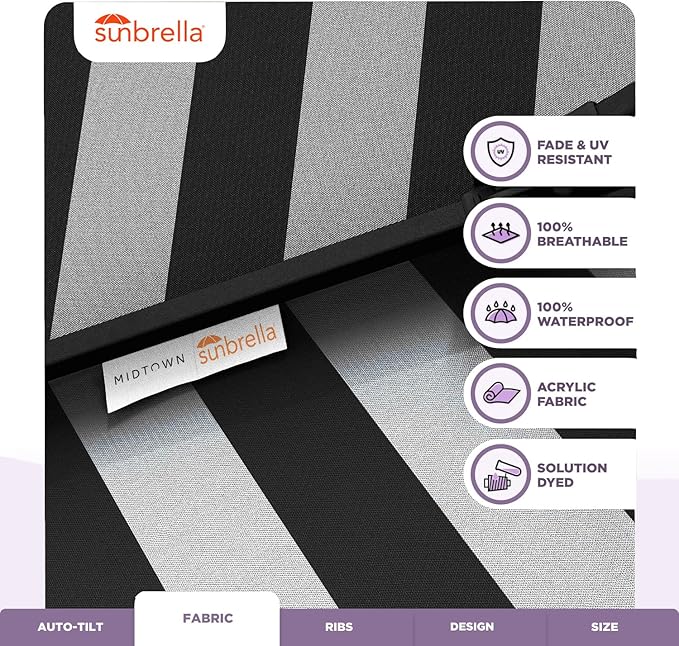 Midtown Umbrellas Sunbrella Umbrella 9 Feet Outdoor Umbrella With Black & White Acrylic Fabric - Auto-Tilt Aluminum Frame Patio Umbrella For Backyard, Deck, Garden, Pool - Black Pole