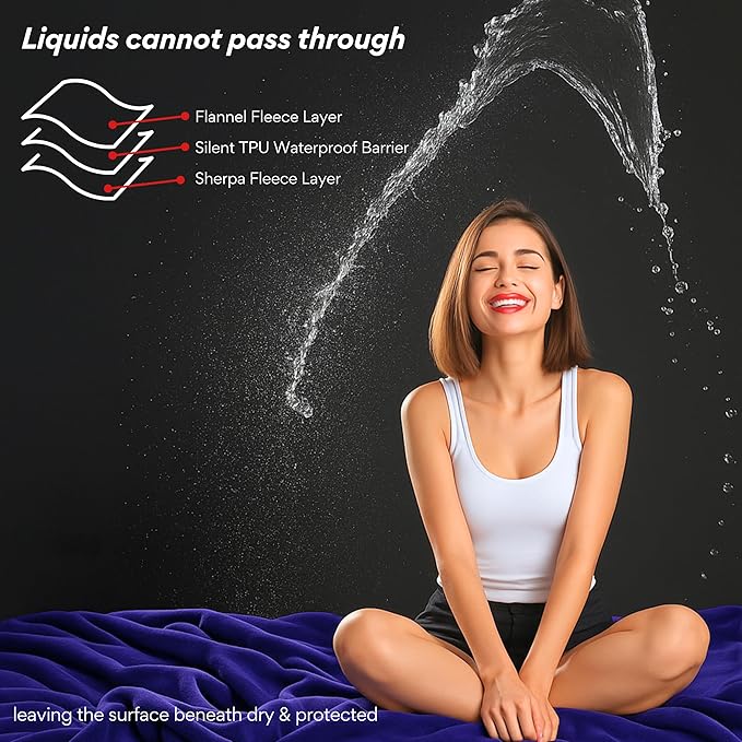 - King size blanket with ultimate moisture barrier. Waterproof bed cover shields the surface beneath from spills, leaks, and accidents—whether on your bed, couch, or favorite cozy spot. Say goodbye to wet spots and hello to dry, dependable comfort.