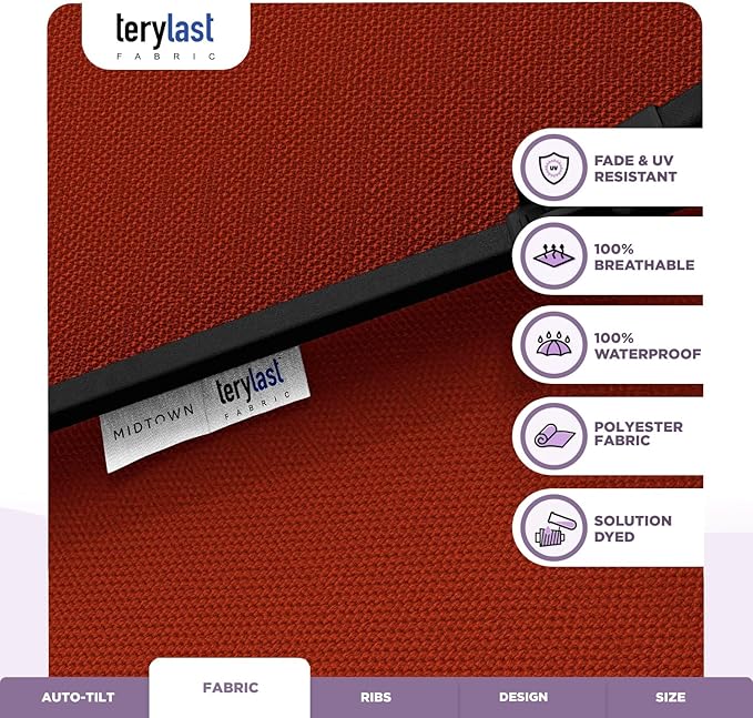 - What You Get: 9 feet aluminum patio umbrella in Terylast Apple (Red). Our outdoor umbrellas for patio can cover a table for 6-8 chairs depending of the shape. To avoid constant defects and replacements, this tilt umbrella is made of a full aluminum outdoor patio umbrella unlike other low end patio umbrellas made of steel and iron. Aluminum is completely rustproof and is also powder coated for extra protection.