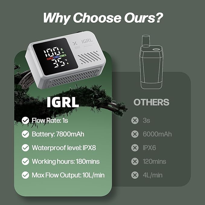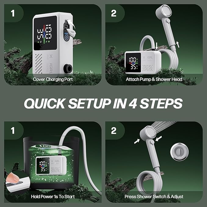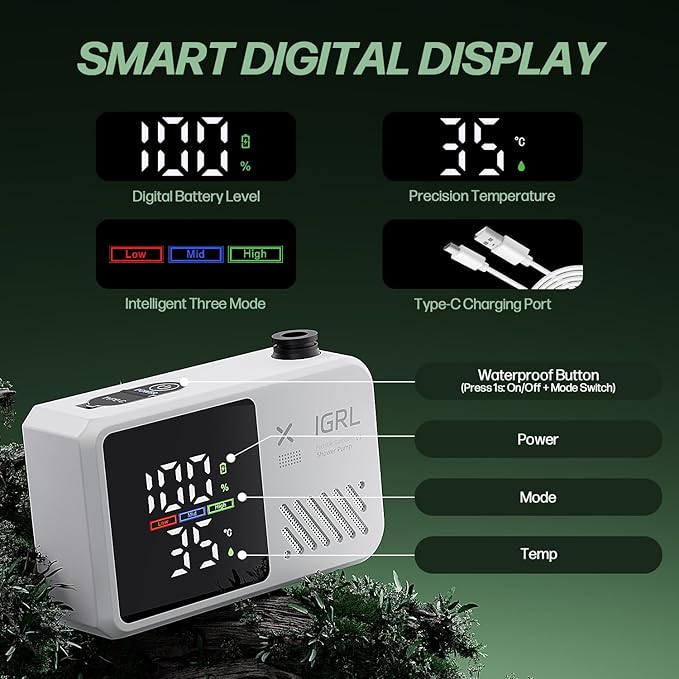 - 【Upgraded 7800mAh Battery & Long Runtime】Provides up to 180 minutes of continuous operation, enough for 8 to 10 comfortable showers. Features a Type-C charging port compatible with phone adapters, power banks, laptops, and car USB. Includes a silicone waterproof cover to ensure safe outdoor charging.