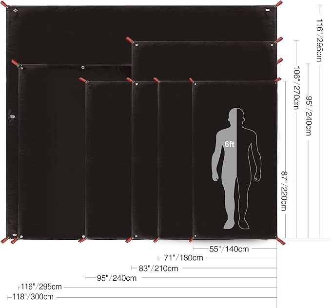 - Camping Tarp for under Tent: Flexible size adjustment makes it suitable for tents of 2 sizes: 8x10ft or 8x8ft. The unfolded size is (116"/95"x95") /(295cm/240cmx240cm), you can place it under the tent to provide additional moisture-proof layer.