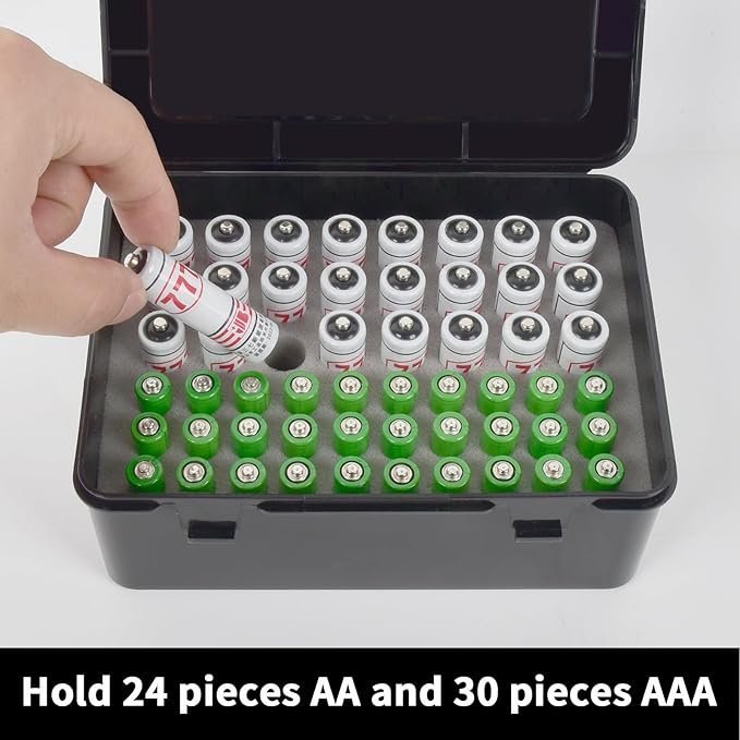 - Great Battery Case Organizer Fits for All Brand Batteries: The rechargeable batteries box fits 24pcs AA, 30pcs AAA specially fits for Energizer/for ACDelco/ for Rayovac/for Panasonic/ for Tenergy.(No batteries included)