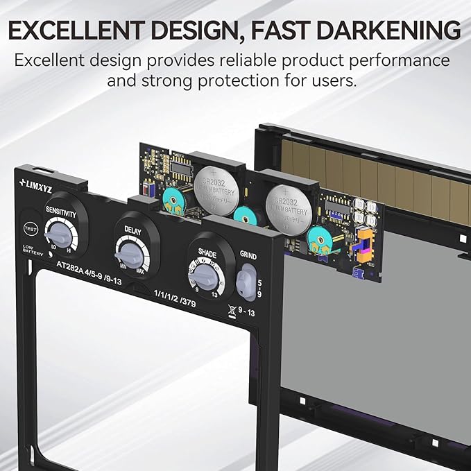 - [Durable] Automatic darkening welding helmet is made of high impact resistant material PP, which has the characteristics of shockproof and flame retardant. Solar cells and replaceable CR2032 battery power supply, sustainable work