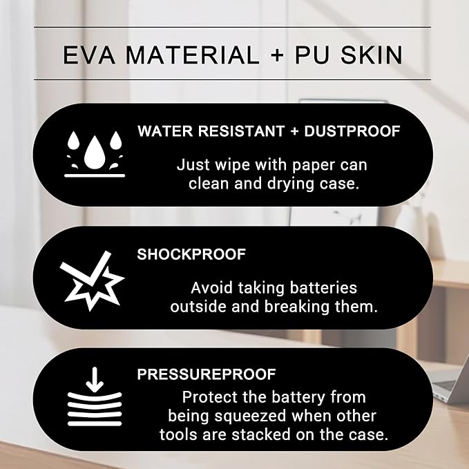 - 【PROTECT BATTERY】 Hard EVA case is shockproof and pressureproof, hard shell and internal sponge act as a shock absorber when the battery case is subjected to external forces such as knocking or dropping.