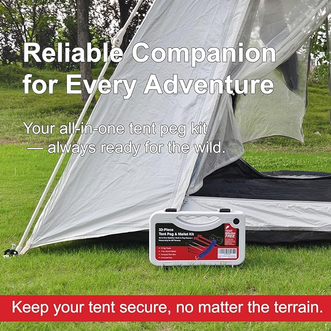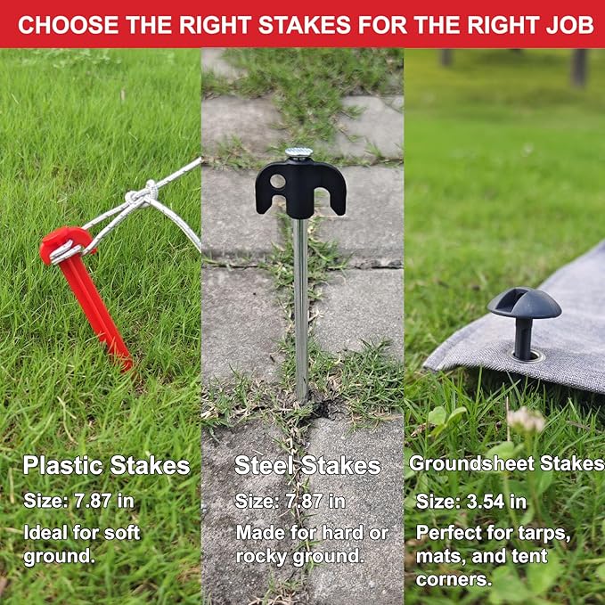 - 【Complete Tent Stakes Kit】 – Includes 33 essential camping accessories: plastic stakes for soft soil, heavy-duty steel stakes for hard ground, and short stakes for tarps or groundsheets. Everything you need to pitch tents securely.