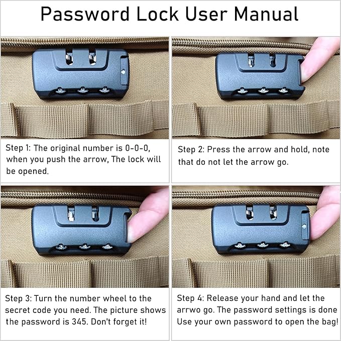 - Combination Lock Operation Instructions: To set your personal Combination. Please follow these steps. 1: Push the button with arrow on the right side to Open the lock(The original number is 0-0-0). 2: Push the button with arrow on the right side and don't let go. Turn the number wheel to the secret code you need. Don't forget the code! 3: Let go and the password setting is done.
