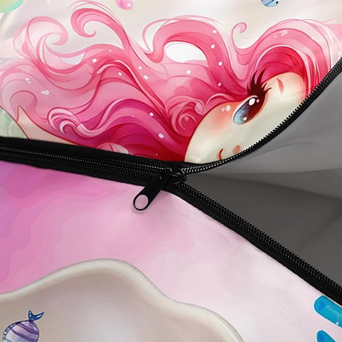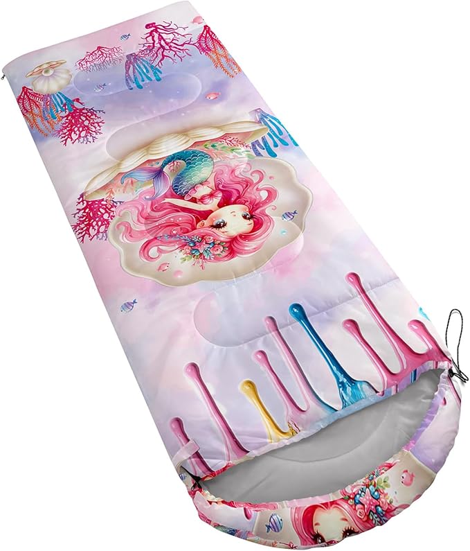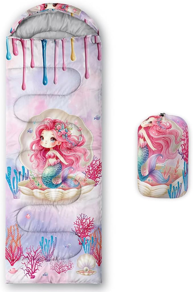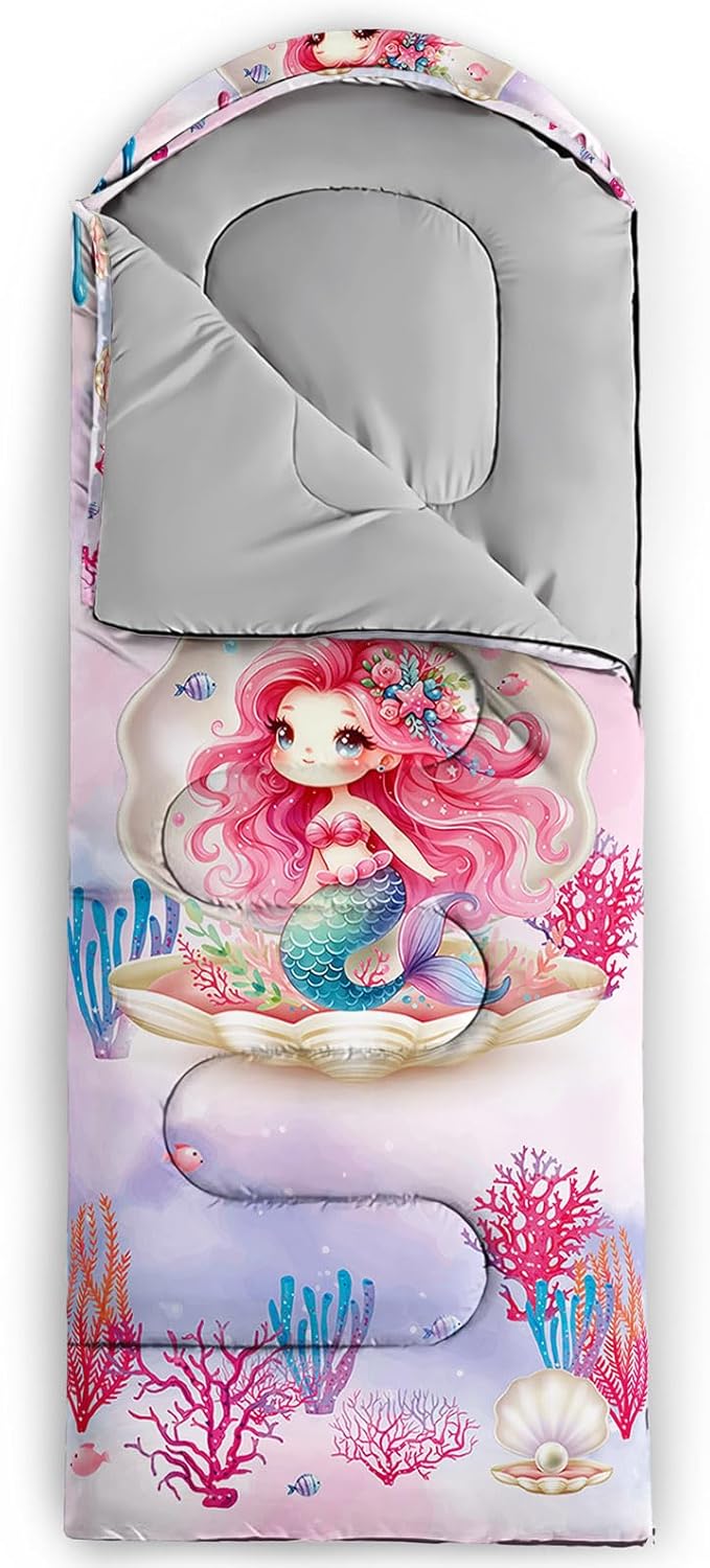 - 【Fashion Design】This sleeping bags for kids is designed with mermaid pattern.Various patterns on this camping sleeping bag including coral,fish and shell.Mermaid is sitting in shell,which adds a comfortable atmosphere.As camping essentials,you can give it as a gift to your family and friends.