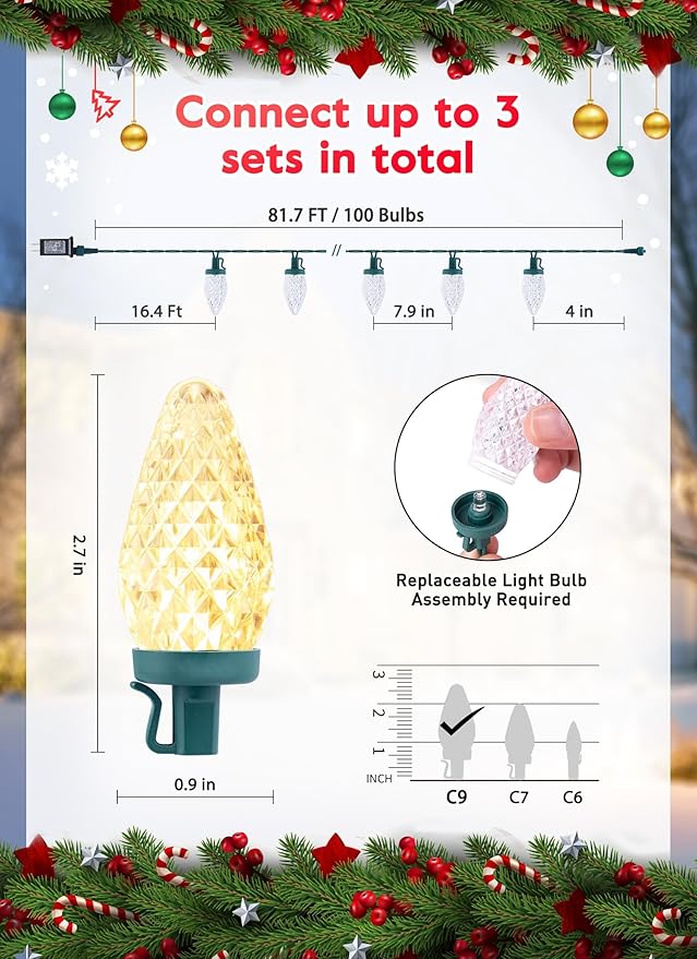 - Special Feature : LED C9 String Lights, Waterproof, 8 Lighting Modes, Timer, Connectable, Christmas Tree Decorations