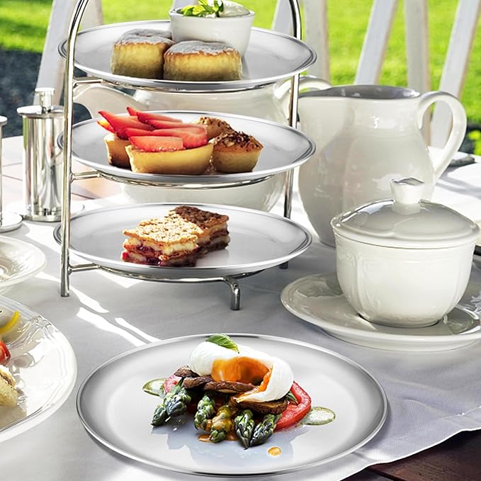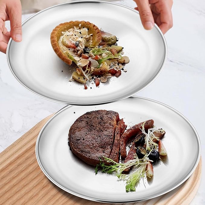 - Decent Quality, 4 pieces nontoxic metal round kids plates set is made of 304(18/8) stainless steel, without harmful substance, ensure the health of kids, toddler and adults, fancy dinner plates with excellent rust and corrosion resistance for strong durability, reusable plates dishes set for 4 to serve you well for a long time