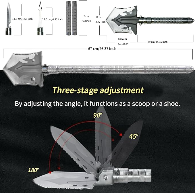 - 【Innovatively Designed Shovel Head】 The Nordpeak camping shovel features a larger, more robust shovel head measuring 5.31" x 4.72", crafted from durable 3CR13 steel for excellent wear and corrosion resistance. Its versatile twist-lock mechanism allows the shovel head to lock at multiple angles: 180° for use as a shovel, 90° for use as a hoe, pickaxe, or hammer, and 45° for use as a hook – offering unmatched flexibility in any outdoor adventure