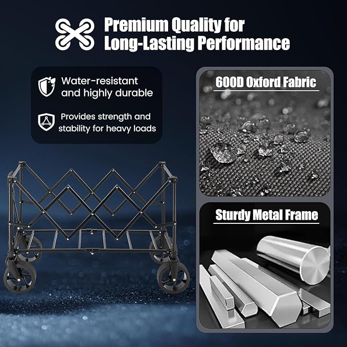 - 【Carry More & Less Effort】The collapsible wagon features a reinforced metal frame that supports up to 360 lbs. The oversized 150L interior (33" x 18.5" x 16") gives you plenty of room for groceries, camping gear, sports equipment, or garden tools. Includes a removable 600D Oxford fabric liner that’s waterproof, easy to clean, and made to handle heavy use. Two mesh cup holders keep your drinks stable and within easy reach on the go.