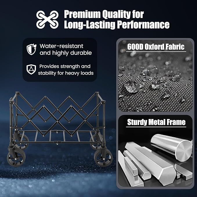 - 【Carry More & Less Effort】The collapsible wagon features a reinforced metal frame that supports up to 360 lbs. The oversized 150L interior (33" x 18.5" x 16") gives you plenty of room for groceries, camping gear, sports equipment, or garden tools. Includes a removable 600D Oxford fabric liner that’s waterproof, easy to clean, and made to handle heavy use. Two mesh cup holders keep your drinks stable and within easy reach on the go.